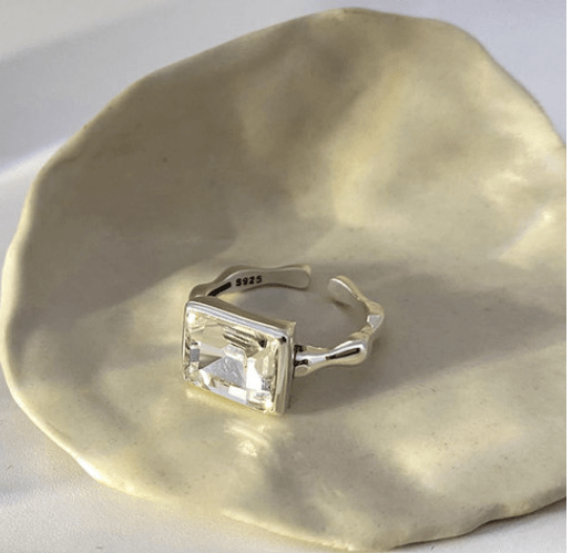 Anillo ajustable en acero plateado con forma irregular y circonita cuarzo blanco rectangular.