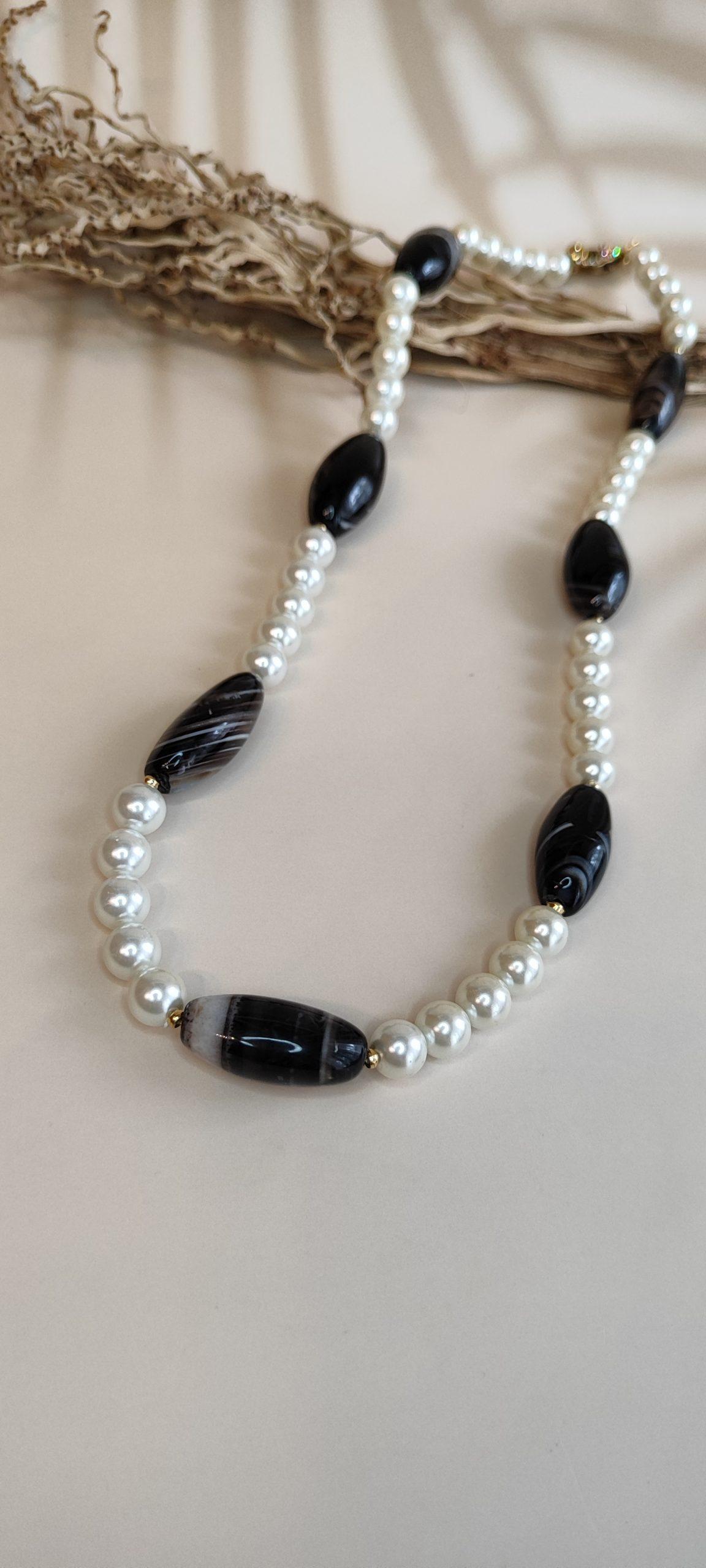 Collar de perlas con ágatas negras. Cierre langosta con circonitas en color dorado.