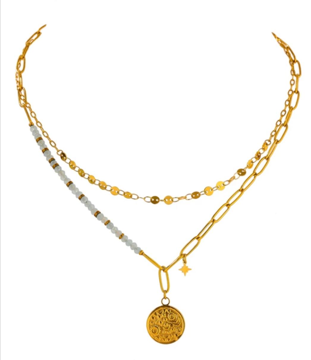 Collar acero dorado doble cadena eslabones pequeños con cristales facetados aguamarina y medalla anochecer