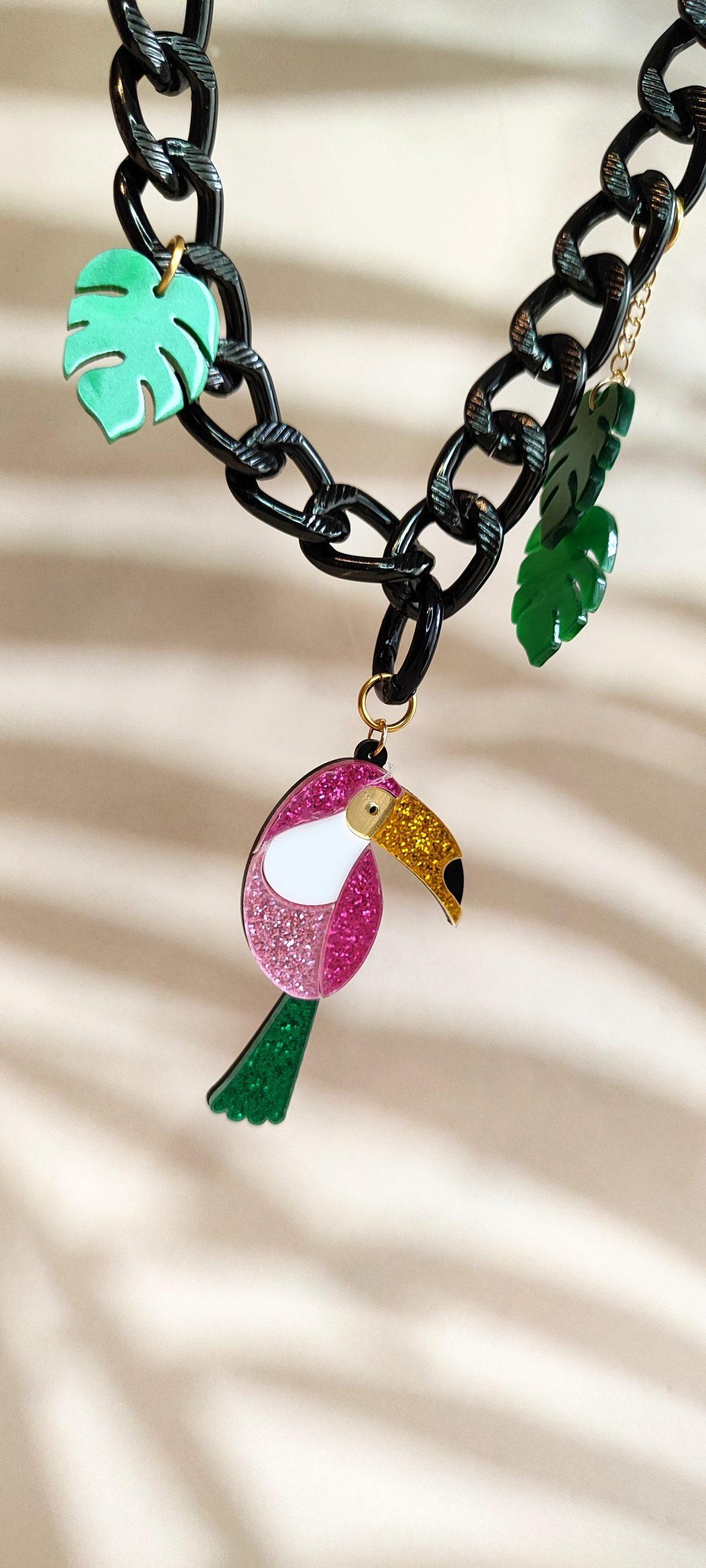 Collar corto con cadena eslabones grandes en color negro-verde con tucán en divertidos colores y hojas de palmera en metacrilato.