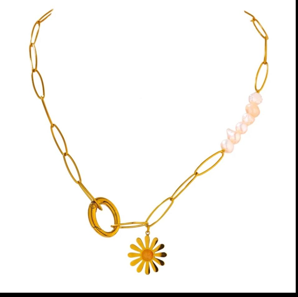 Collar acero dorado eslabones alargados con entre piezas perlas y detalle en flor.