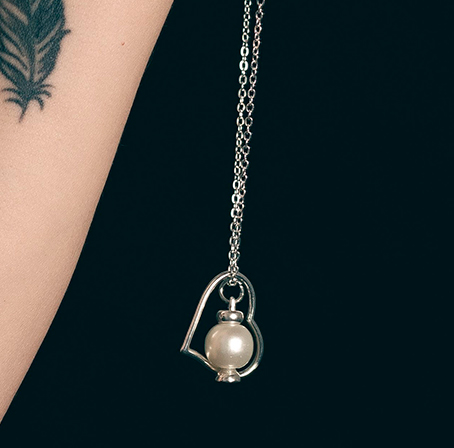 Collar plateado cadena larga con adorno corazón y perla vintage.