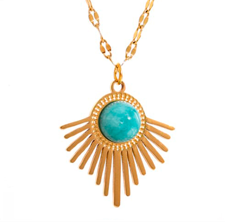 Collar gargantilla de acero dorado con adorno pieza triangular y pequeña turquesita.
