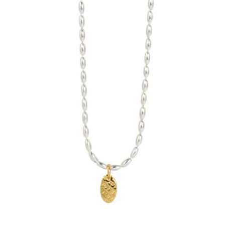 Collar gargantilla de plata con cadena clavicular en forma de grano de arroz con pequeña chapa en dorado LOVE.