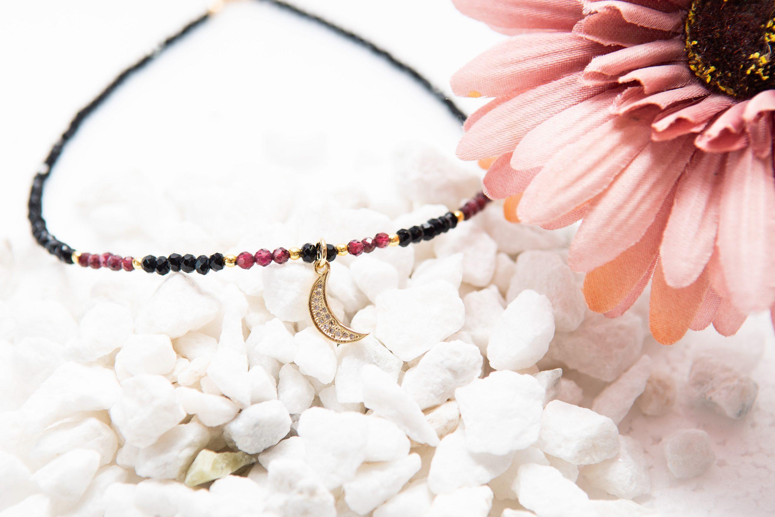 Gargantilla con mineral espinela negra y pequeño colgante luna dorada con circonitas en color.