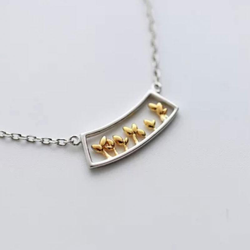 Gargantilla en plata con adorno rectangular con pequeñas flores en dorado.
