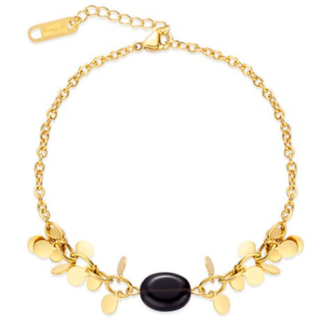 Pulsera en acero color dorado con cadena ornamentos y pequeña pieza en jade negro.