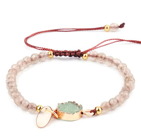Pulsera dorada con bolas facetadas en cuarzo con cordón ajustable y pequeña piedra drusa.