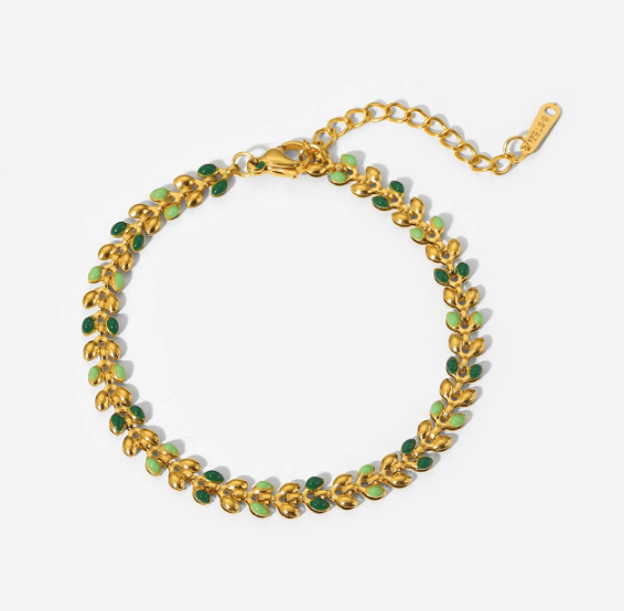 Pulsera en acero color dorado con hojas esmaltadas en verde.