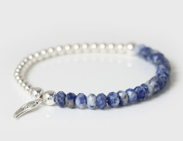 Pulsera elástica con abalorio ala de ángel de cuentas facetadas en sodalita y bolas plateadas.