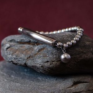 Pulsera plateada con pequeñas piezas tipo cubo y adorno circonita verde y perla